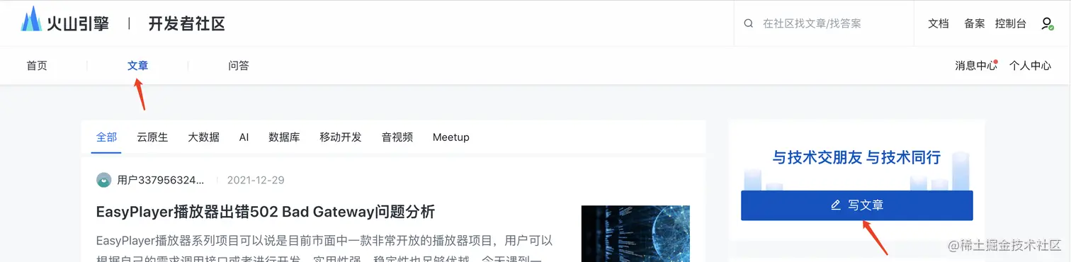 - 在规定时间段内注册火山引擎开发者社区帐号并在社区【文章】板块发布文章,文章标题结构:XXXX|社区征文。示例:“火山引擎全栈云原生架构实践|社区征文”
