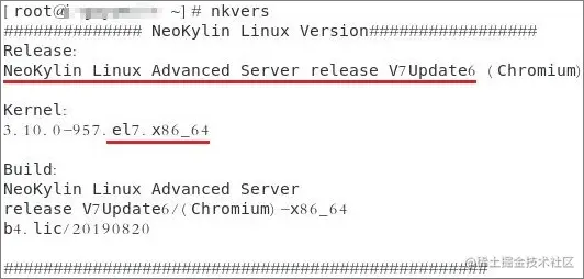服务器的操作系统为中标麒麟7,中标麒麟可以通过nkvers命令,查看操作系统详细信息:
