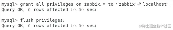 grant all privileges on zabbix.* to 'zabbix'@'localhost';
