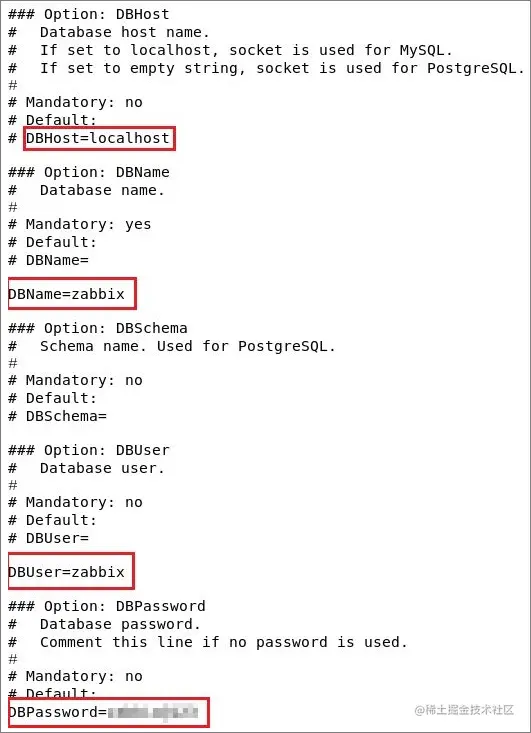 DBHost、DBName、DBUser和DBPassword分别设置MySQL地址、数据库名称、用户名和密码(由于MySQL与Zabbix Server部署在同一台虚拟机,'DBHost'这里使用了默认的localhost):