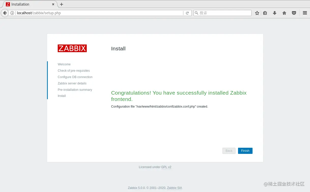 本文所采用的是源码安装方式,此处会看到如下页面,需要点击【Download the configuration file】连接,下载zabbix.conf.php文件,并将此文件放置在Zabbix前端文件的conf目录下(也就是/var/www/html/zabbix/conf/),完成后点击【Finish】按钮: