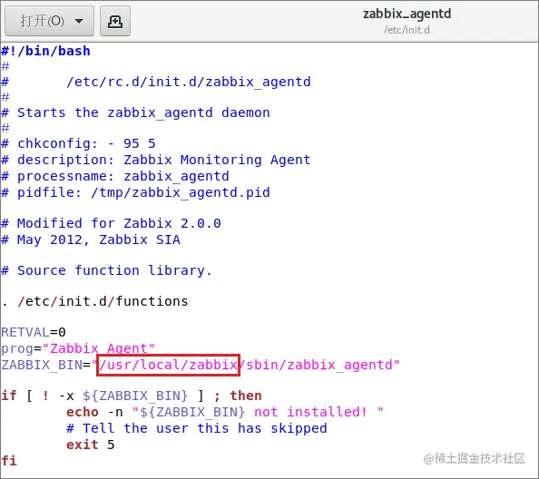 修改/etc/init.d/zabbix_agentd文件中ZABBIX_BIN的值(我们之前指定了安装目录为/usr/local/zabbix,而所拷贝的自启脚本中则是默认的安装路径/usr/local):