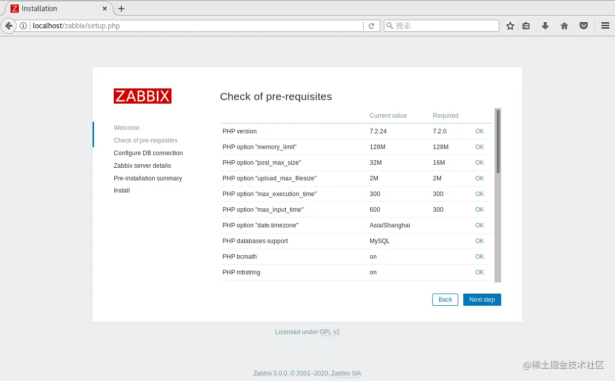 访问http://localhost/zabbix/,会跳转至http://localhost/zabbix/setup.php,进行Zabbix的初始化配置: