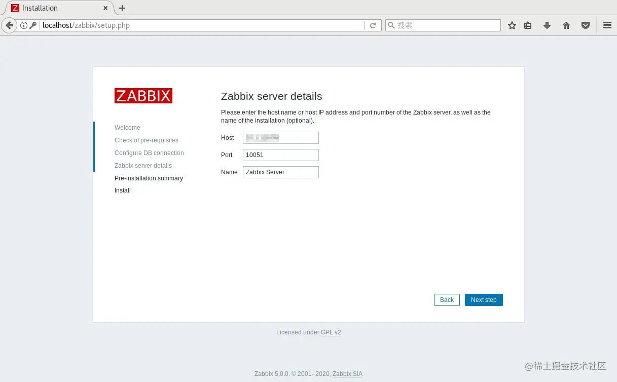 此处若没有配置为真实的ip地址,后续会在Web页面中,一直提示“Zabbix server is not running: the information displayed may not be current.”此错误虽然不会影响Zabbix运行与监控的功能,但却十分碍眼,且较难修复,因此一定要在最初就设置好Host。