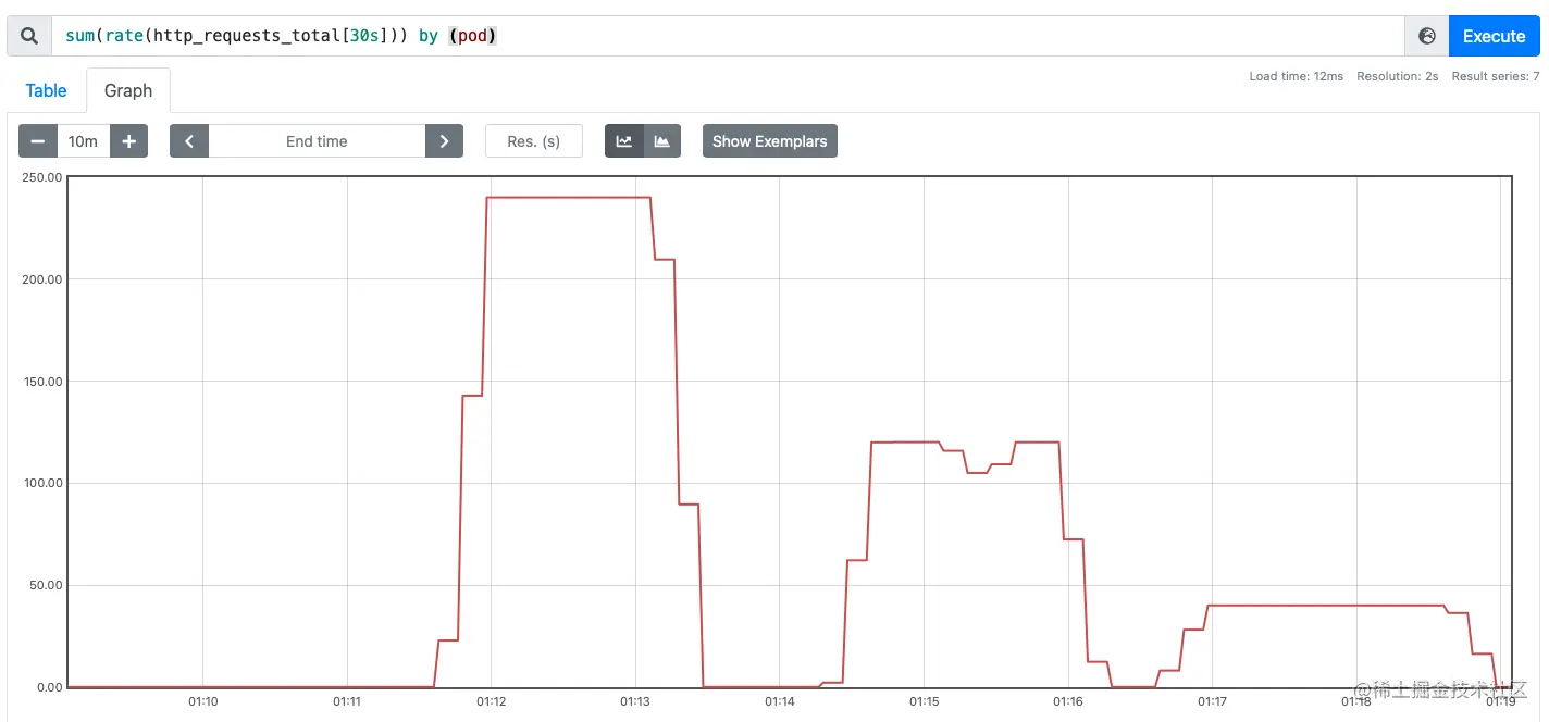 这里查询 Pod 的 RPS 使用 sum(rate(http_requests_total[30s])) by (pod) 语句查询: