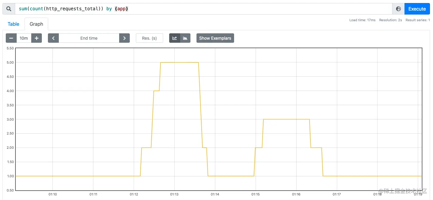 从 Prometheus 的 web 界面上观察请求量与示例数的变化: