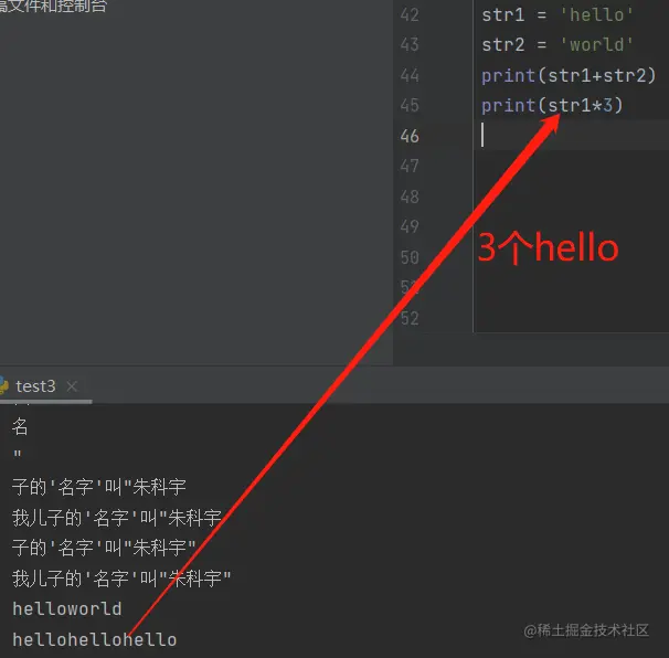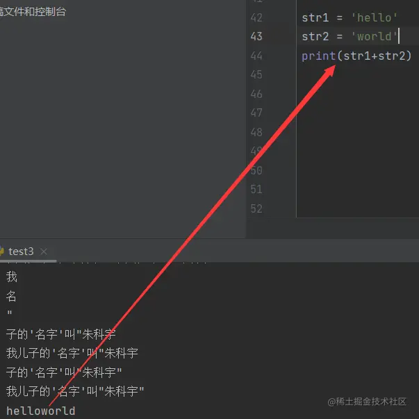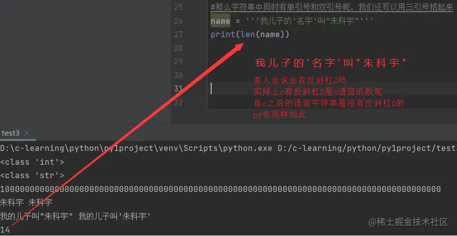 #字符串内容中就包含了引号的话就可以灵活搭配使用了 #如果字符串中有双引号 那么整体就用单引号 #如果字符串中有单引号 那么整体就用双引号 name1 = '朱科宇' name2 = "朱科宇" print(name1,name2) name1 = '我的儿子叫"朱科宇"' name2 = "我的儿子叫'朱科宇'" print(name1,name2)那么字符串中同时有单引号和双引号呢,我们还可以用三引号括起来