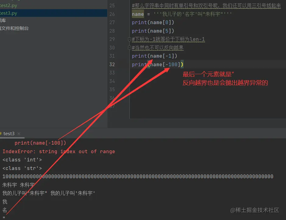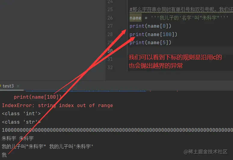 #那么字符串中同时有单引号和双引号呢,我们还可以用三引号括起来 name = '''我儿子的'名字'叫"朱科宇"''' print(name[0]) print(name[100]) print(name[5])与c极大不同的地方 下标可以为负数