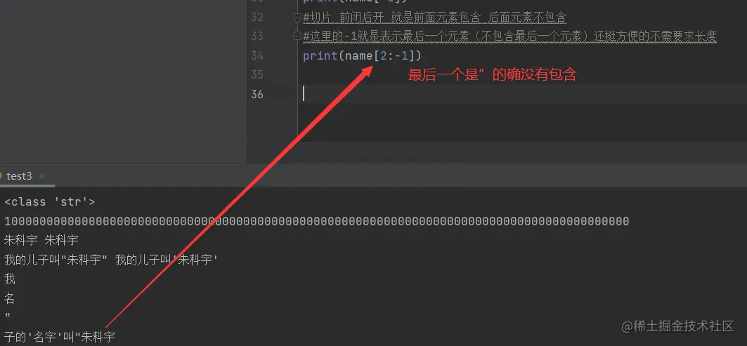 #切片 前闭后开 就是前面元素包含 后面元素不包含 #这里的-1就是表示最后一个元素(不包含最后一个元素)还挺方便的不需要求长度 print(name[2:-1])当然也可以省略