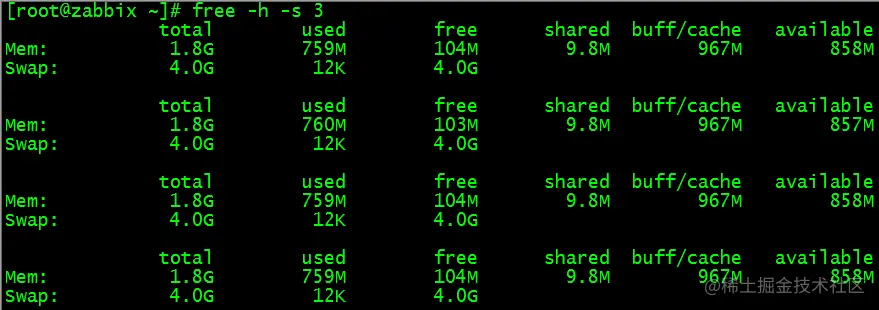 - 持续的观察内存的状况,每间隔多少秒输出内存情况,使用 -s 选项并指定间隔的秒数,