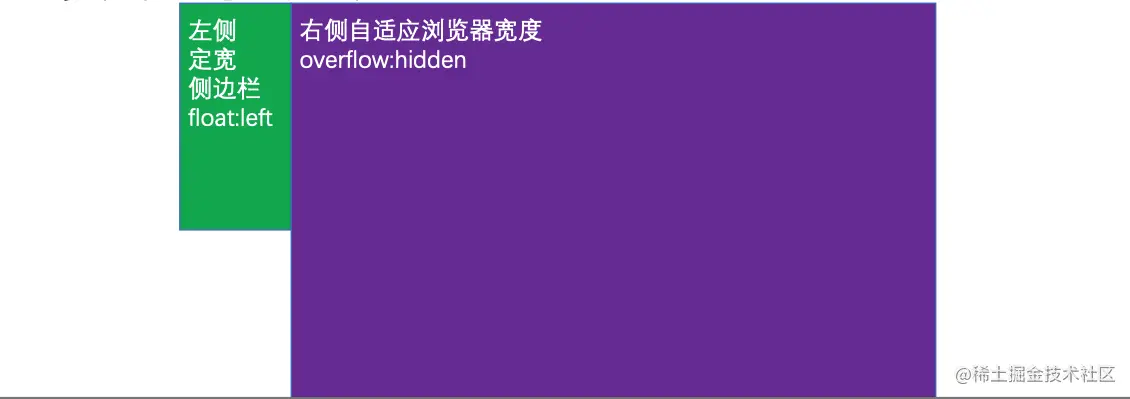 - 原理: 右边元素overflow:hidden后,形成BFC渲染区域。左边的float元素就不能进入右边范围了。