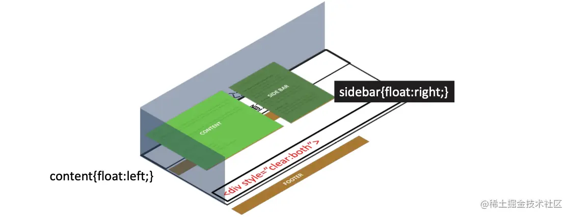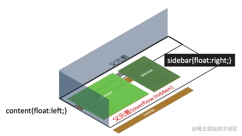 - 缺点:会产生新的浮动影响。比如,父元素浮动,导致父元素之后平级的页脚div上移,被父元素挡住。