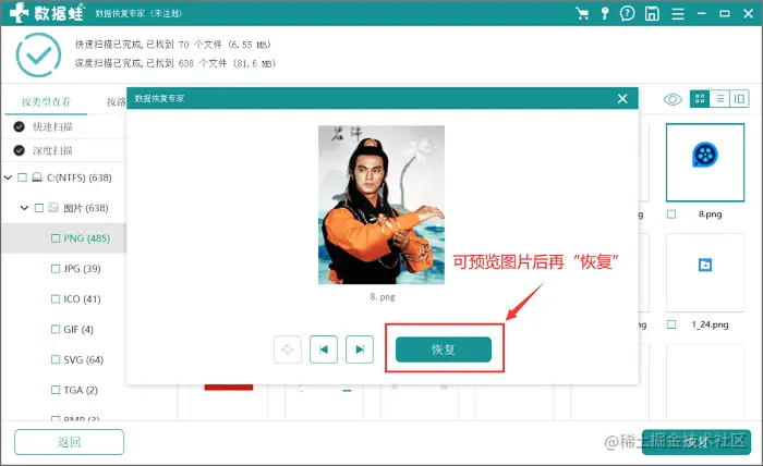 第3步:选择你要恢复的图片文件,图片类文件大部分都是可以先双击一下预览的,所以建议先预览一下确认再恢复(如下图所示)。确认无误点击“恢复”,可以选择恢复后的路径哦!