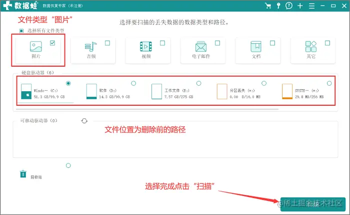 第2步:开始操作了,文件类型不用多想就是选择图片,扫描区域的话你可以选择回收站或者图片删除前的住处(位置)。选择好了点击“扫描”;