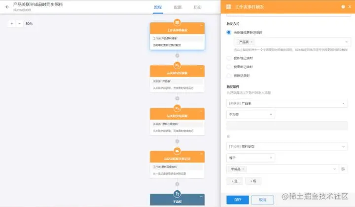 物料清单更新或者新增时触发,同时限定条件产品表及触发的物料类型为半成品(限定触发类型是因为本条工作流最终的效果是需要新增类型为原料的明细,如果流程中不限定类型的话,工作流就会反复被触发)。