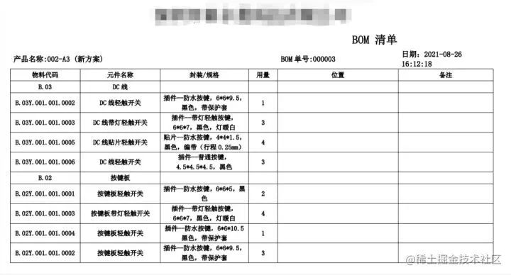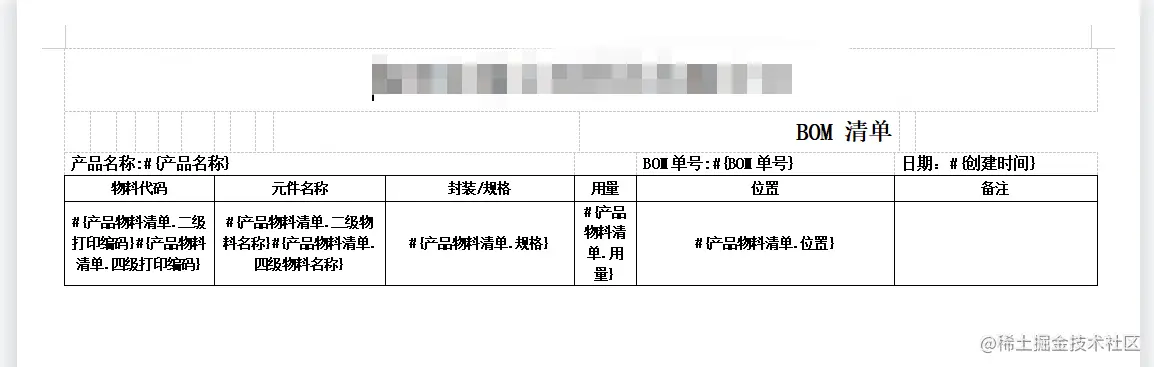 不少客户都要把BOM表单打印出来,以便在生产车间核对。而我们搭建出来的BOM清单最终的打印模版配置和效果如下图所示。以下效果图和最初对照搭建的BOM表单十分相似。