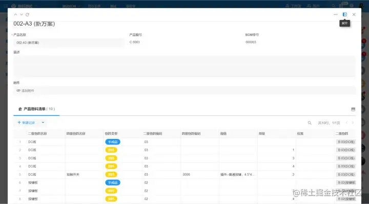 完成物料表单的搭建后,下一步要配置产品表单。作者选取了一个典型的BOM表单作为参考的成品效果,并对应地配置表单字段。