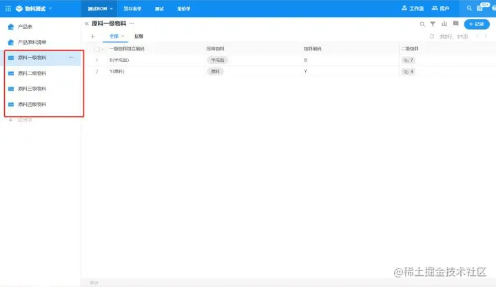 除了产品表单以外,我们还需要有一张产品物料清单,以此来罗列每个产品对应需要的半成品以及原料。这样以便物料自动汇总和排序,并且方便制作更简洁的BOM打印模板。 每个产品记录将关联其对应的产品物料清单,效果如下图: