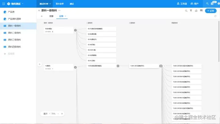 下一步是对层级之间的数据做关联,高一级与下级之间都为一对多的关系。当我们建立好数据后,我们可以用层级视图来清晰地展示物料详细信息和层级关系。