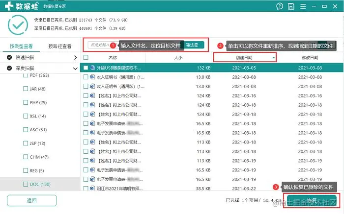 步骤3.扫描结果出来后,找到想要恢复的文件,勾选文件名称左侧的小方格或者双击文件预览后恢复也行,最后点击“恢复”!
