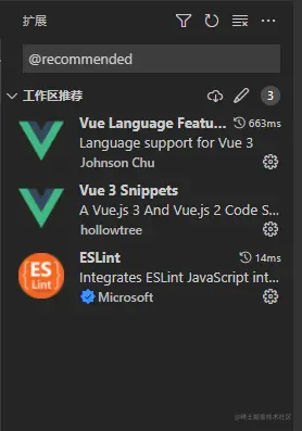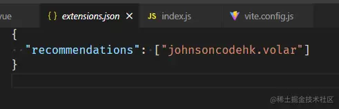 同样的道理,项目创始人在创建项目的时候新建一个extensions.json,并把自己觉得需要推荐的插件写到里面,这样当团队成员下载这个项目的时候,就可以去查看需要下载的插件。比如之前一直推荐的vetur现在对vue3的支持不是很友好,官方现在推荐用volar,所以就可以写在里面extensions.json