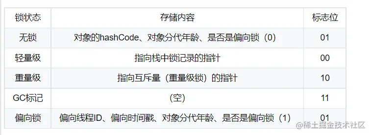 注意到这里的无锁和偏向锁在”Mark Word”的倒数第三bit中分别采用0和1标记。
