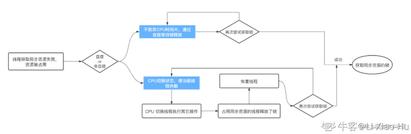 - 获取互斥锁的线程,如果锁已经被占用,则该线程将进入睡眠状态;获取自旋锁的线程则不会睡眠,而是一直循环等待锁释放。