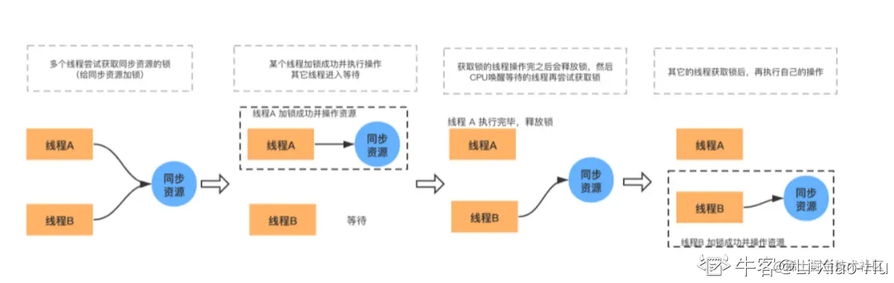 在访问共享资源之前对进行加锁操作,在访问完成之后进行解锁操作。加锁后,任何其他试图再次加锁的线程会被阻塞,直到当前进程解锁。
