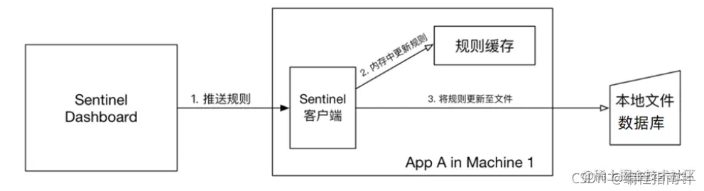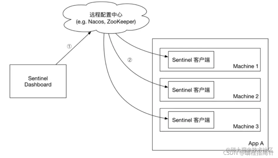push模式:控制台将配置规则推送到远程配置中心,例如Nacos。Sentinel客户端监听Nacos,获取配置变更的推送消息,完成本地配置更新。
