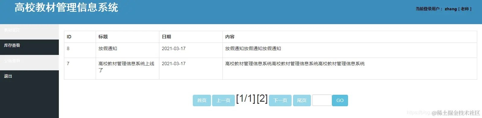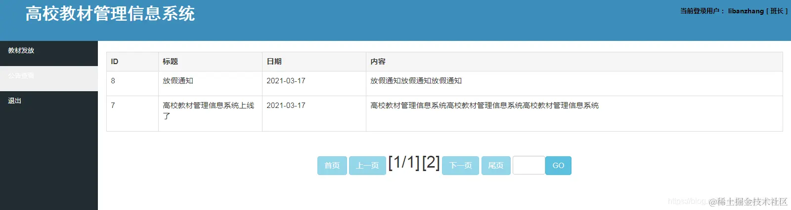 本项目基于SSM实现高校教材管理系统,主要实现教材的证订、发放等相关流程操作。系统分为三个角色:一是管理员角色可以进行所有功能模块信息的相关管理操作;二是教师角色,主要实现教材的征订申请及管理;三是班长角色,主要实现教材的发放工作。教材的征订和发送均需管理员进行审批通过后才可以进行。
