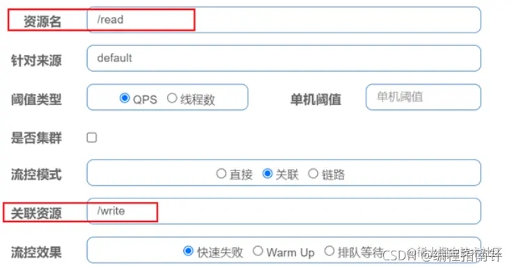 语法说明:当/write资源访问量触发阈值时,就会对/read资源限流,避免影响/write资源。