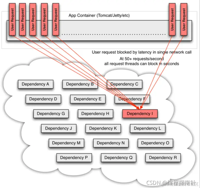 但是,依赖服务I的业务请求被阻塞,用户不会得到响应,则tomcat的这个线程不会释放,于是越来越多的用户请求到来,越来越多的线程会阻塞: