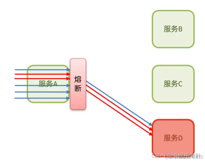 当发现访问服务D的请求异常比例过高时,认为服务D有导致雪崩的风险,会拦截访问服务D的一切请求,形成熔断: