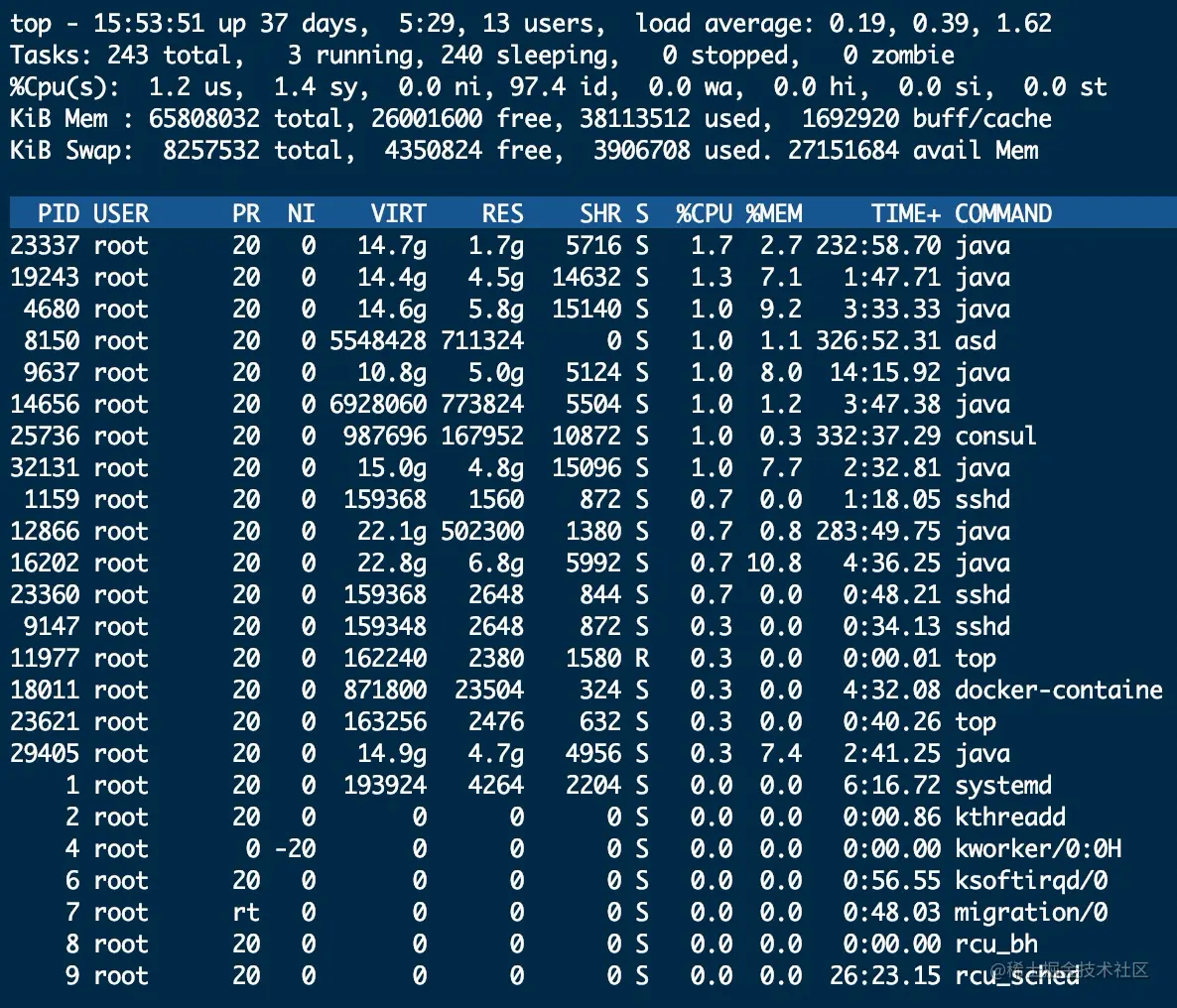 1.top - 15:54:51 up 37 days, 5:30, 14 users, load average: 0.52, 0.42, 1.55