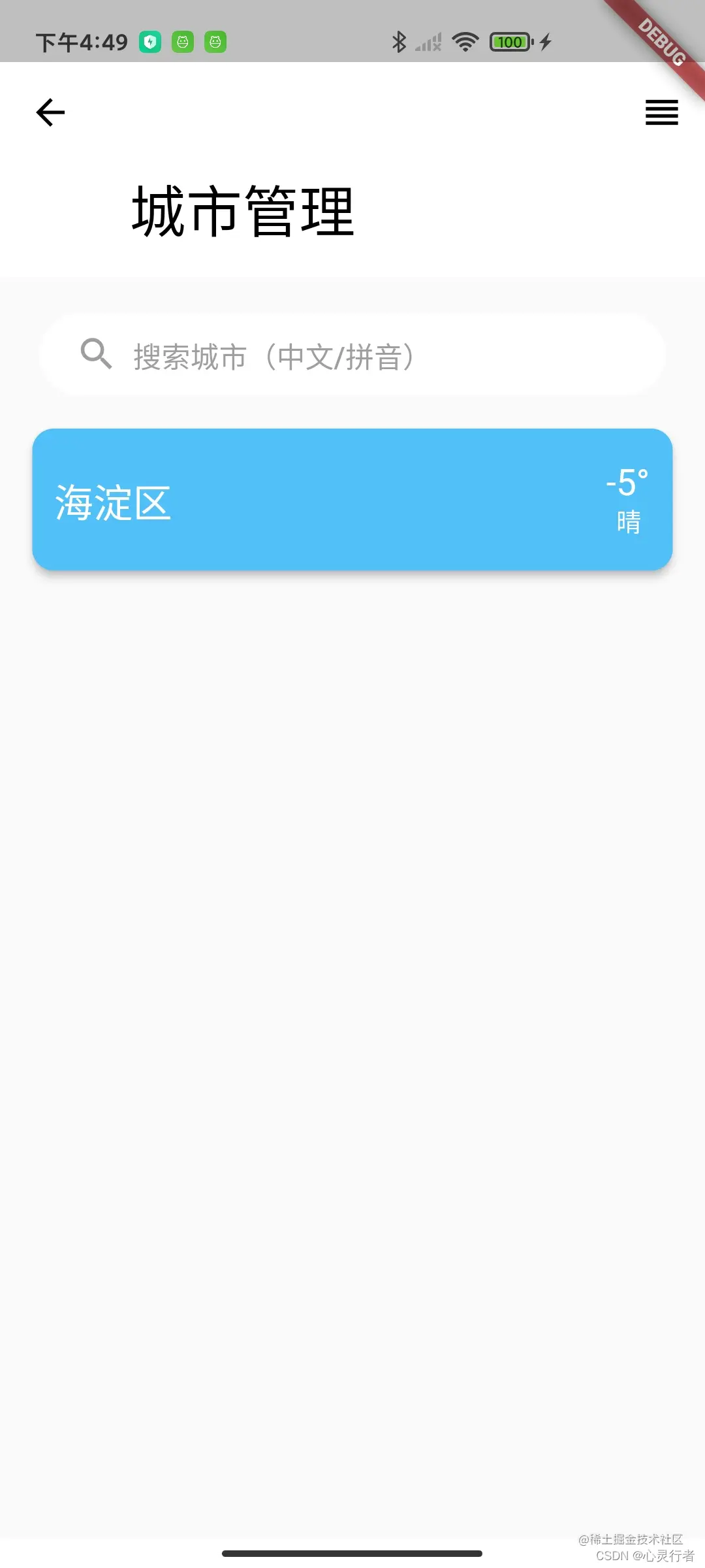 知天气是取知晓天气更知晓你的含义。该应用主要功能包含关注的城市的天气信息,城市管理,城市搜索等功能,小到小时级天气信息,空气质量信息以及风力风向,大到7天的天气预报信息以及全国范围内的天气云图。知天气主要采用Flutter技术开发,采用现阶段主流的Bloc框架,项目中同时做到了原生和Flutter的通信。