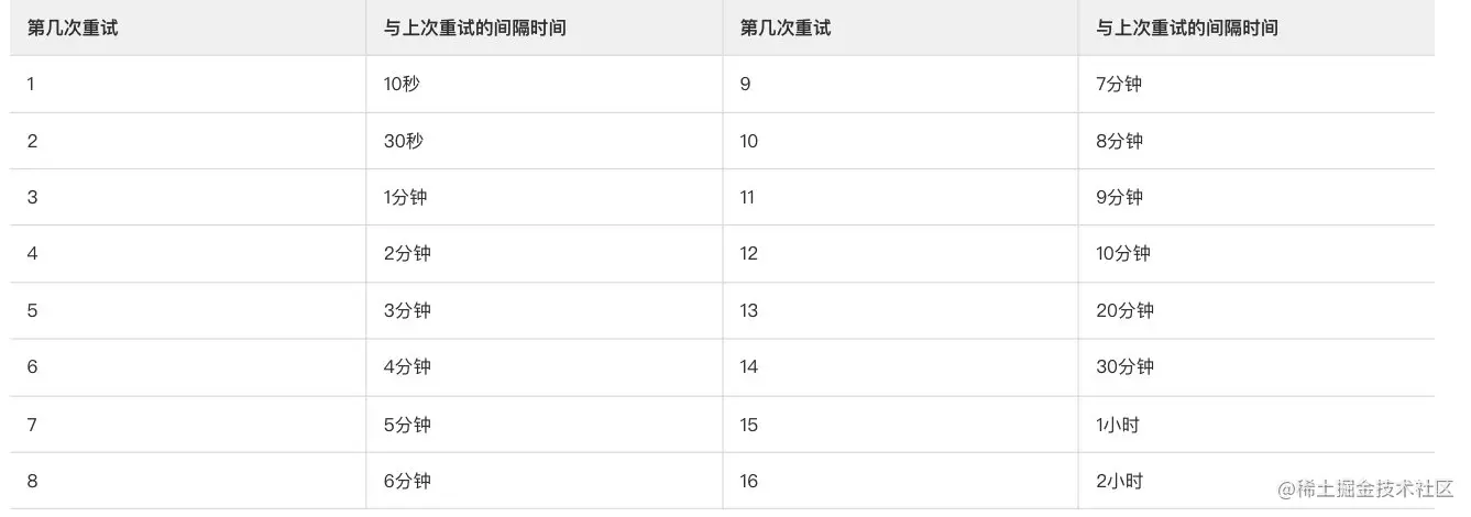 间隔时间根据重试次数阶梯变化,取值范围:1 秒~2 小时。不支持自定义配置。