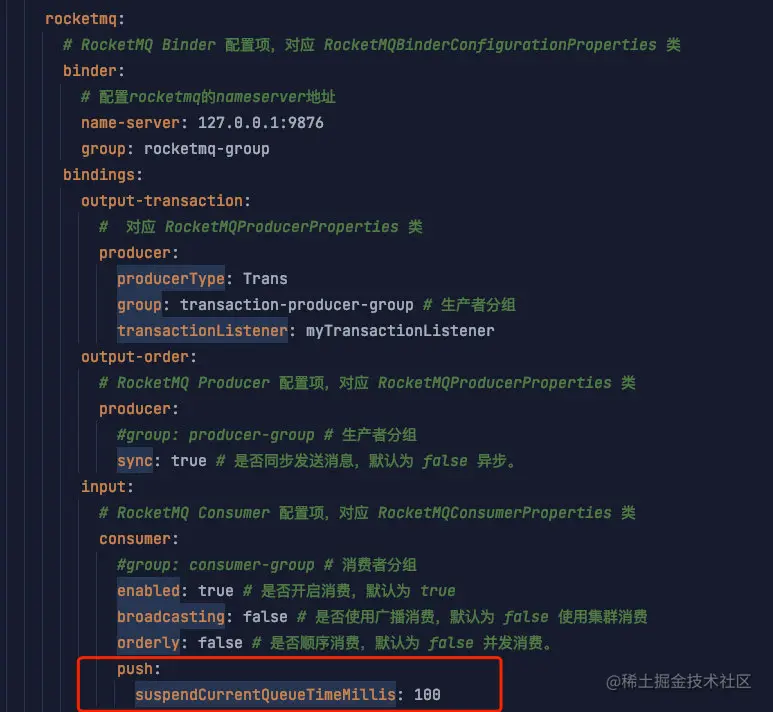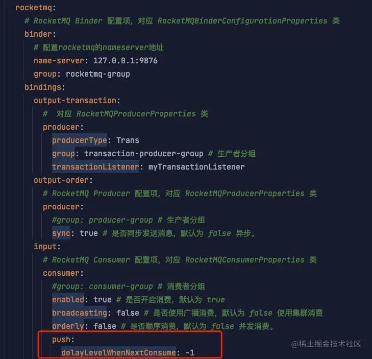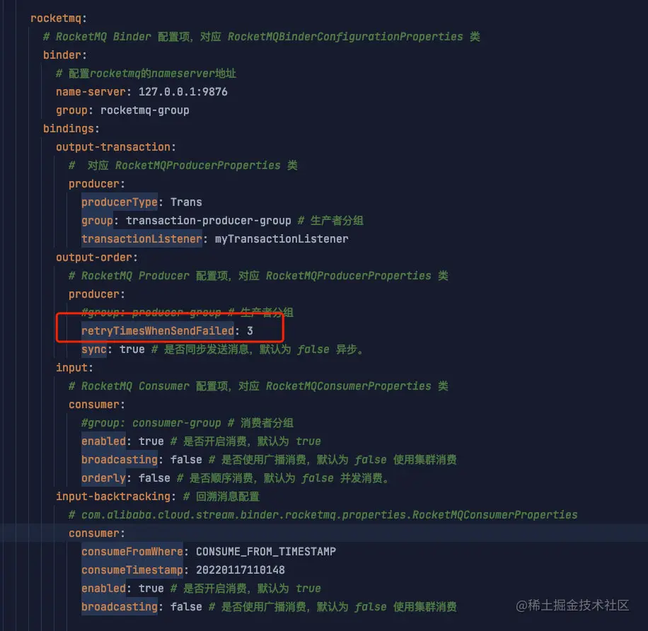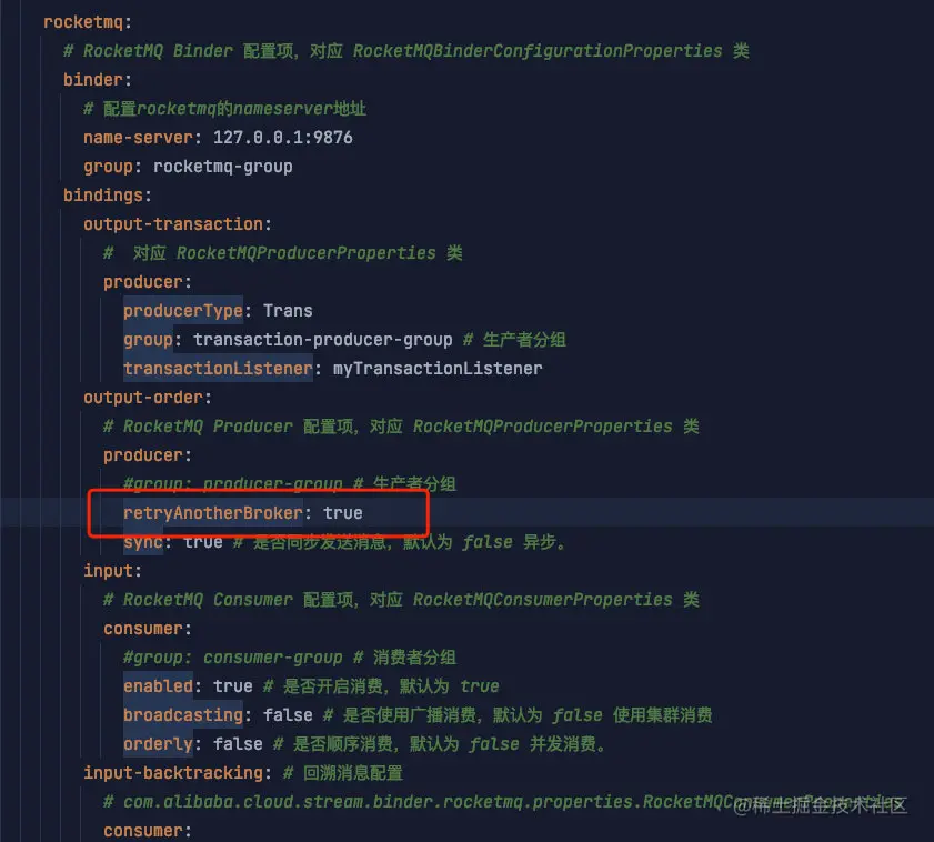 在我们 Spring Cloud Stream + Spring Cloud Alibaba RocketMQ 的 例子的配置里,我们可以这样配置: