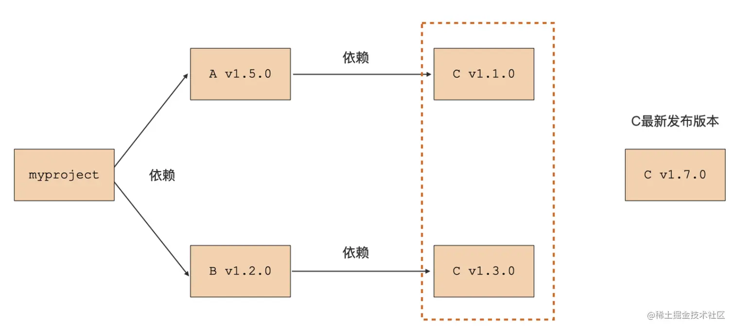 - 但 A 依赖 C 的 v1.1.0 版本,而 B 依赖的是 C 的 v1.3.0 版本,并且此时 C 包的最新发布版为 C v1.7.0