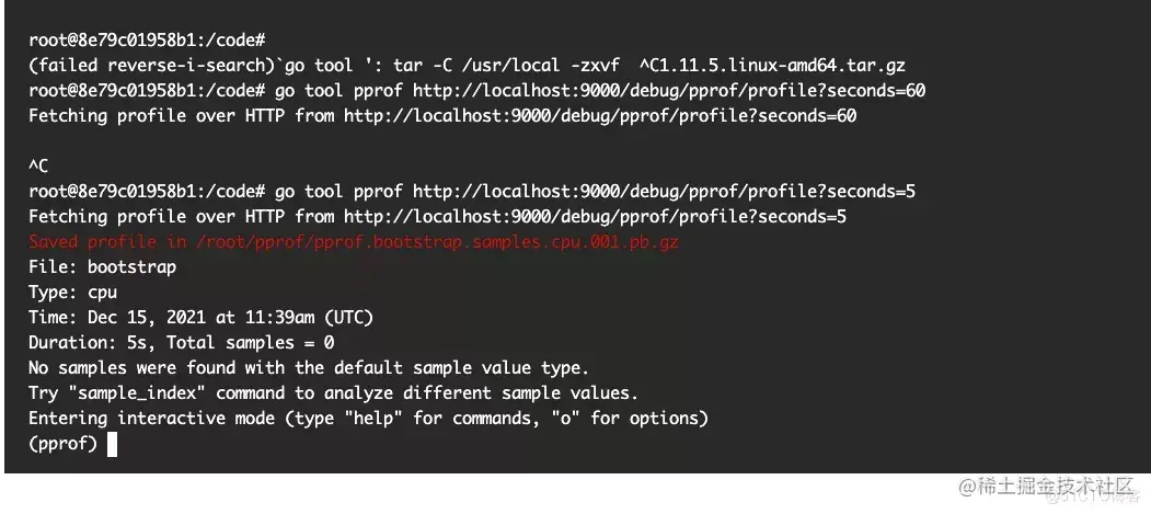 - 执行 go tool pprof 命令,并产生分析文件:/root/pprof/pprof.bootstrap.samples.cpu.001.pb.gz,