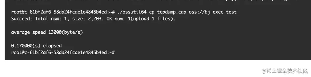 - 抓包完毕,借助 OSS 命令行工具 ossutil64 ,将 tcpdump.cap 文件上传到自己的 OSS ,然后下载到本地借助分析工具 wireshark 可以进行分析。
