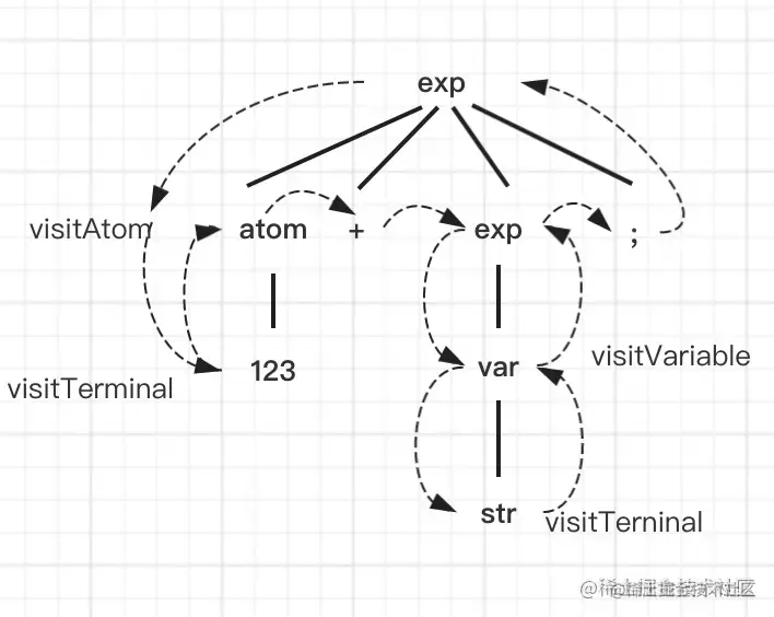现在我们开始实现 visitor,我们的目标是实现查询当前光标位置所处节点的全部上下文,所谓全部上下文,就是我们的目标节点(光标位置的节点)和他全部的祖先节点,并且以有序列表的形式提供,例如下图中,str 的全部上下文就是 [exp, exp, var, str] 这样一个队列。值得注意的是,用户实际光标的位置不一定在某一个具体的节点上,他可能存在于某个空白字符的位置,这种情况下,上下文列表的最后一个节点一定不是一个 AST 上的终结符节点,而是包含了用户光标位置的最小一个的语法节点,这种情况就不需要我们给出任何提示。