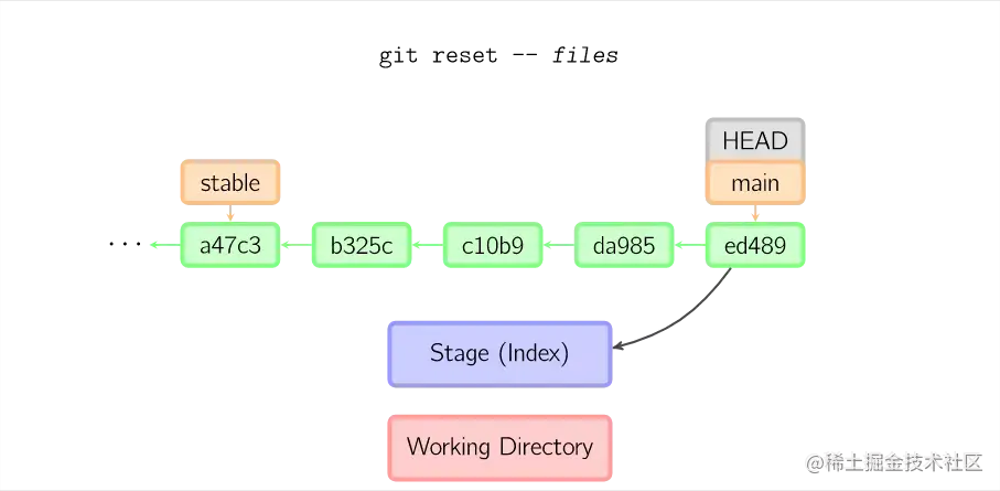 如果没有给出提交点的版本号,那么默认用HEAD。这样,分支指向不变,但是索引会回滚到最后一次提交,如果用--hard选项,工作目录也同样。