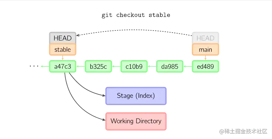 当不指定文件名,而是给出一个(本地)分支时,那么HEAD标识会移动到那个分支(也就是说,我们“切换”到那个分支了),然后暂存区域和工作目录中的内容会和HEAD对应的提交节点一致。新提交节点(下图中的a47c3)中的所有文件都会被复制(到暂存区域和工作目录中);只存在于老的提交节点(ed489)中的文件会被删除;不属于上述两者的文件会被忽略,不受影响。