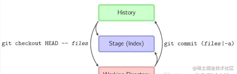 - git commit files进行一次包含最后一次提交加上工作目录中文件快照的提交。并且文件被添加到暂存区域。