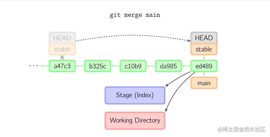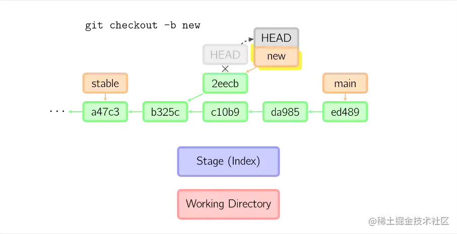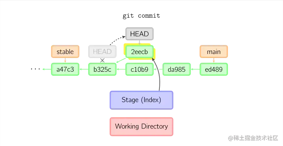 一旦此后你切换到别的分支,比如说main,那么这个提交节点(可能)再也不会被引用到,然后就会被丢弃掉了。注意这个命令之后就不会有东西引用2eecb。