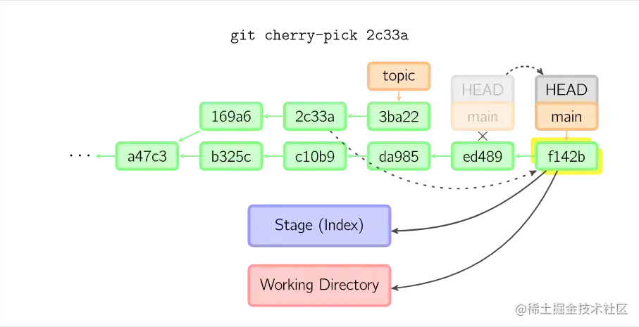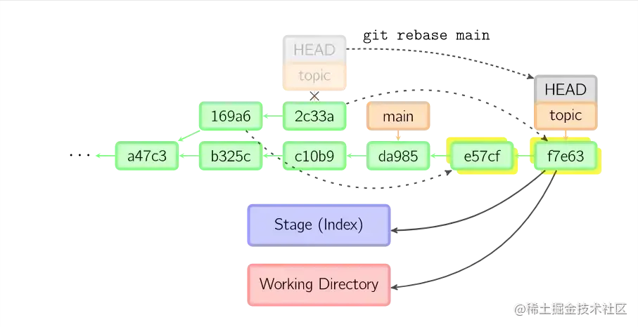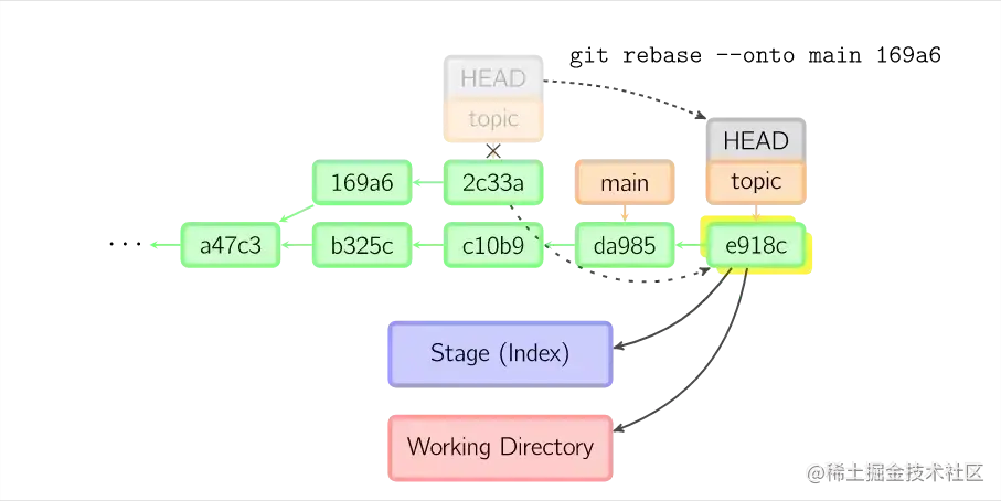 上面的命令都在topic分支中进行,而不是main分支,在main分支上重演,并且把分支指向新的节点。注意旧提交没有被引用,将被回收。要限制回滚范围,使用--onto选项。下面的命令在main分支上重演当前分支从169a6以来的最近几个提交,即2c33a。