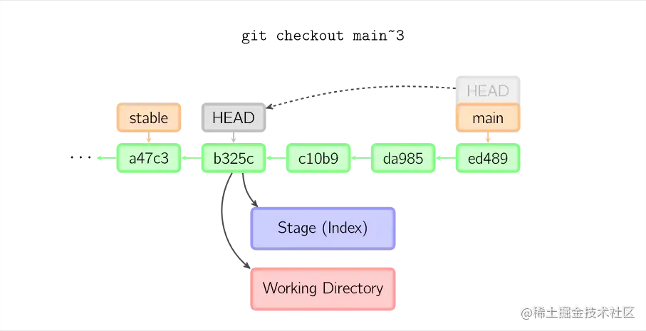 如果既没有指定文件名,也没有指定分支名,而是一个标签、远程分支、SHA-1值或者是像main~3类似的东西,就得到一个匿名分支,称作detached HEAD(被分离的HEAD标识)。这样可以很方便地在历史版本之间互相切换。比如说你想要编译1.6.6.1版本的git,你可以运行git checkout v1.6.6.1(这是一个标签,而非分支名),编译,安装,然后切换回另一个分支,比如说git checkout main。然而,当提交操作涉及到“分离的HEAD”时,其行为会略有不同,详情见在下面。