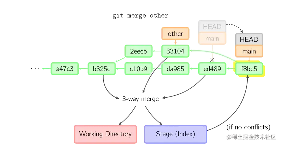 否则就是一次真正的合并。默认把当前提交(ed489 如下所示)和另一个提交(33104)以及他们的共同祖父节点(b325c)进行一次三方合并。结果是先保存当前目录和索引,然后和父节点33104一起做一次新提交。