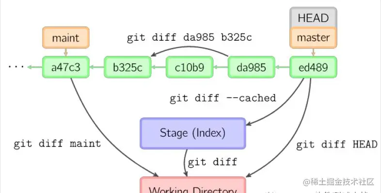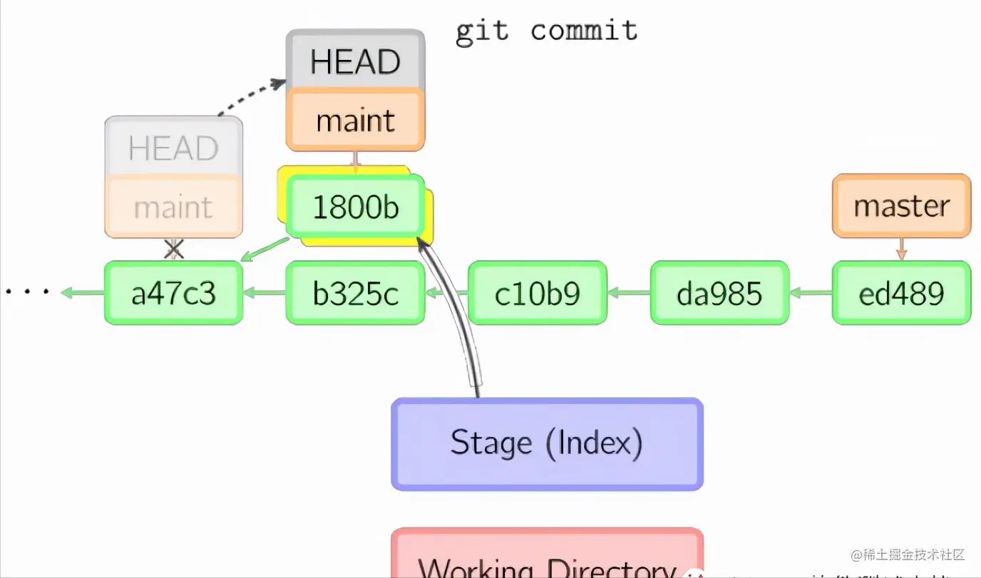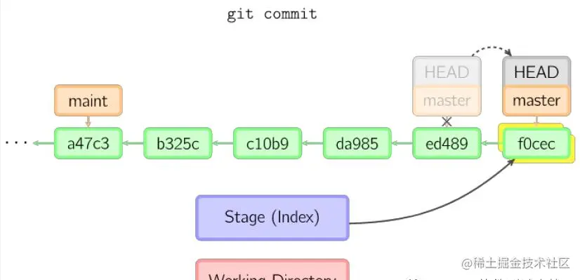 提交时,git用暂存区域的文件创建一个新的提交,并把此时的节点设为父节点。然后把当前分支指向新的提交节点。下图中,当前分支是main。在运行命令之前,main指向ed489,提交后,main指向新的节点f0cec并以ed489作为父节点。