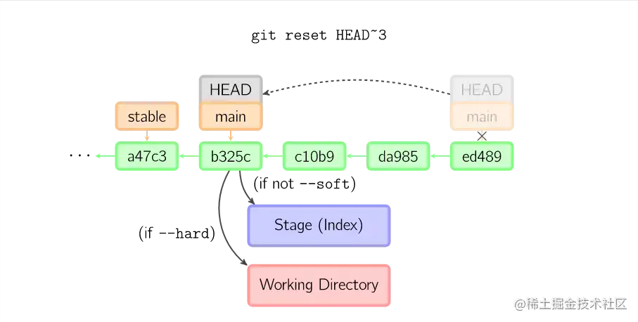 reset命令把当前分支指向另一个位置,并且有选择的变动工作目录和索引。也用来在从历史仓库中复制文件到索引,而不动工作目录。如果不给选项,那么当前分支指向到那个提交。如果用--hard选项,那么工作目录也更新,如果用--soft选项,那么都不变。